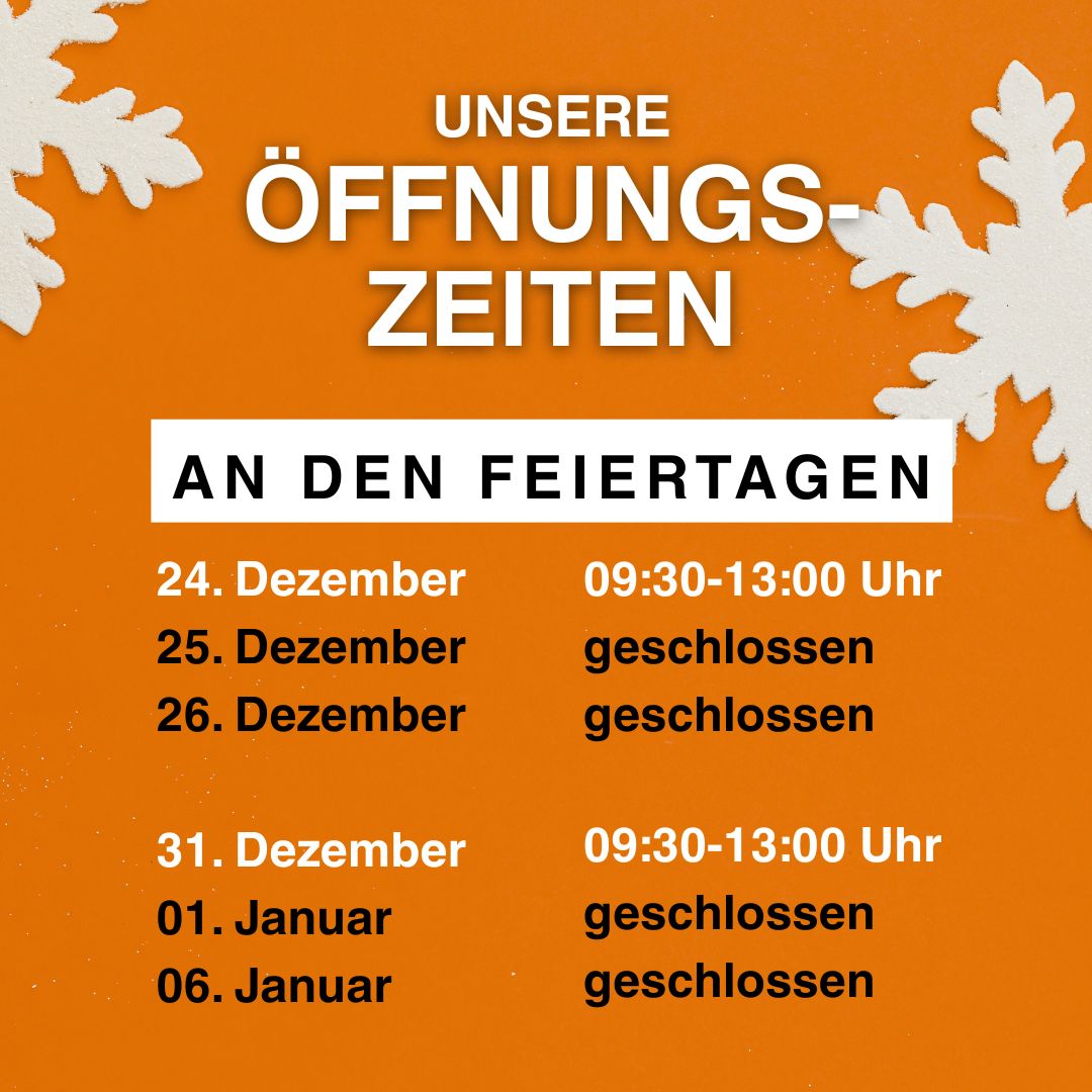 Am Mittwoch den 24.12. und 31.12. haben wir 9:30-13:00 Uhr geöffnet.